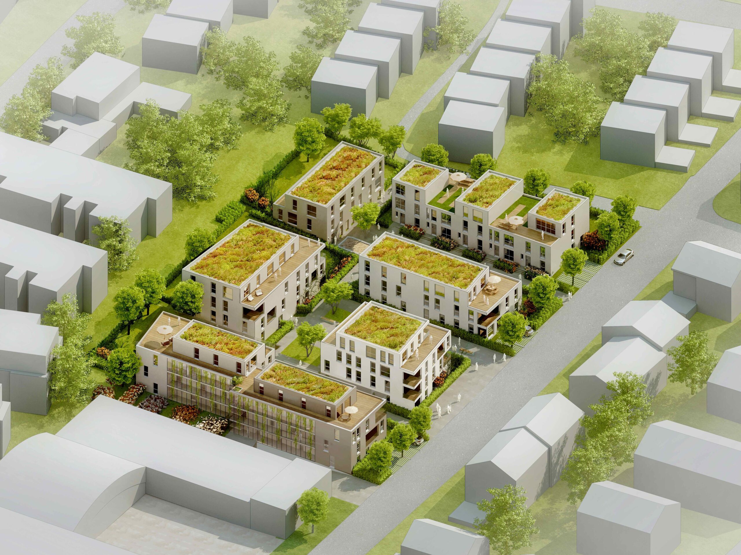 Hier treffen modernes Wohnen, soziale Vielfalt und nachhaltige Konzepte aufeinander und bilden einen neuen, attraktiven Lebensmittelpunkt. Ob kompakte Reihenhäuser, großzügige Geschosswohnungen oder gemeinschaftlich orientierte Clusterwohnungen – die Architektur vereint Vielfalt und Identität. Hochwertige Materialien, klar strukturierte Grundrisse und durchdachte Fassaden sorgen für ein stimmiges und zugleich individuelles Gesamtbild.